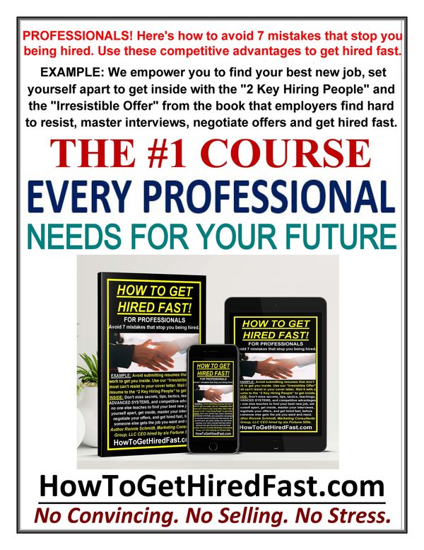 Ronnie Schmidt, CEO, Author teaches you his newest NO CONVINCING, NO SELLING, NO STRESS PROVEN WAY to SET YOURSELF APART and get inside the company you're considering working for with the "2 Key Hiring People" and the "Irresistible Offer" employers find hard to resist to get the interviews you will need to get the job you want.